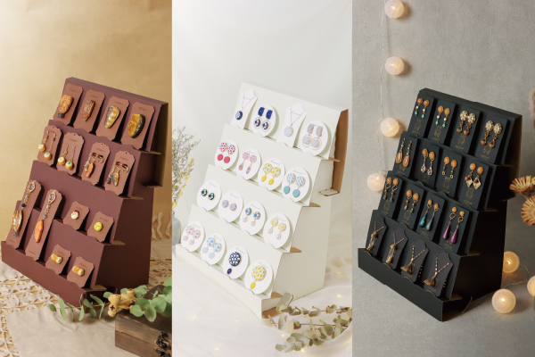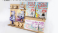グッズやポストカードなどのディスプレイに向いた斜め棚ディスプレイ。