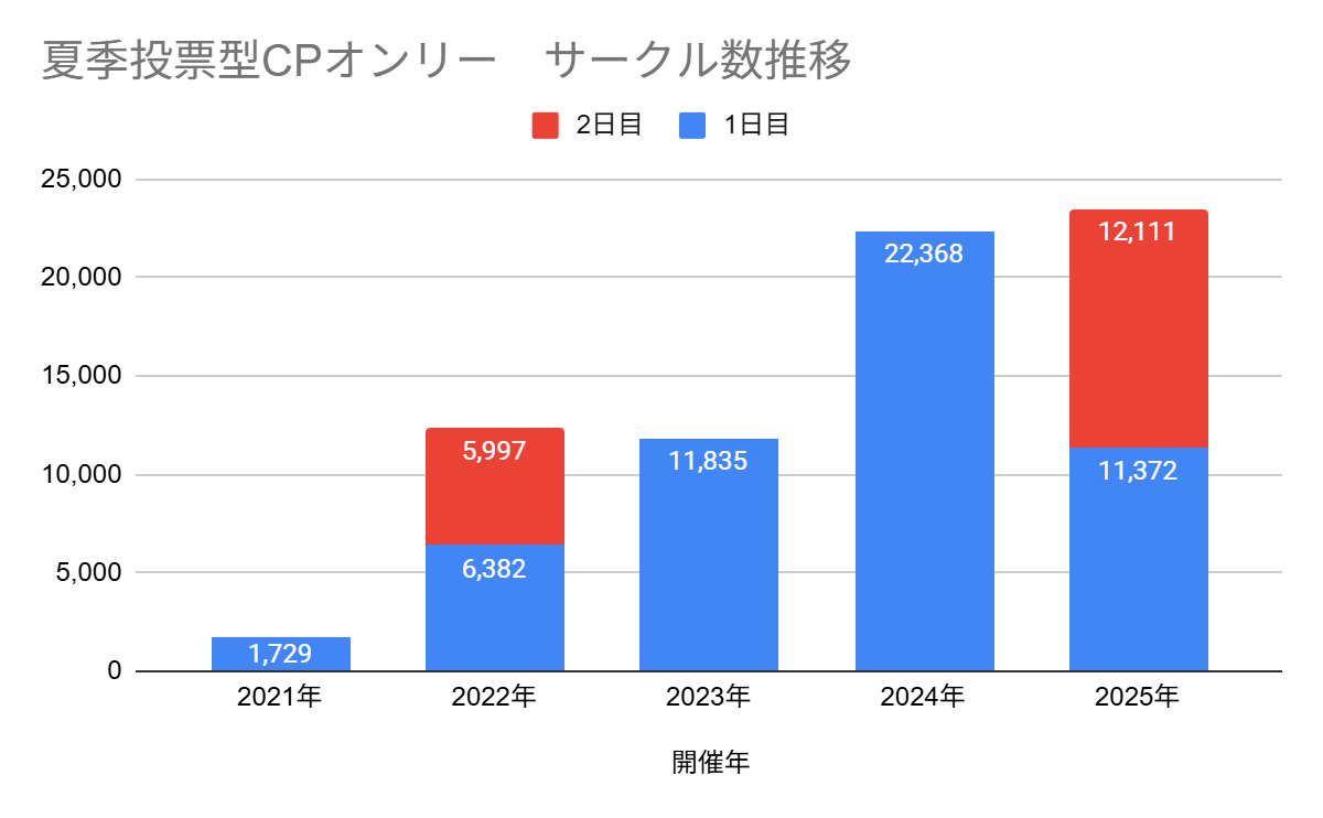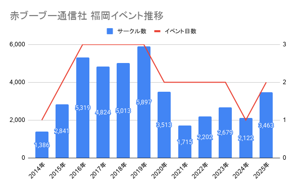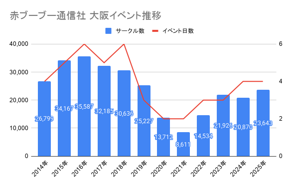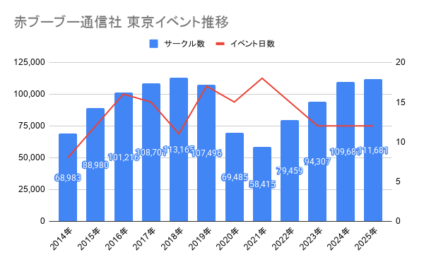 2025年の赤ブー主催はイベント開催日数18日、総参加サークルは138,787サークルでした。同じイベント名でも別日程のものはグラフも分かれています。