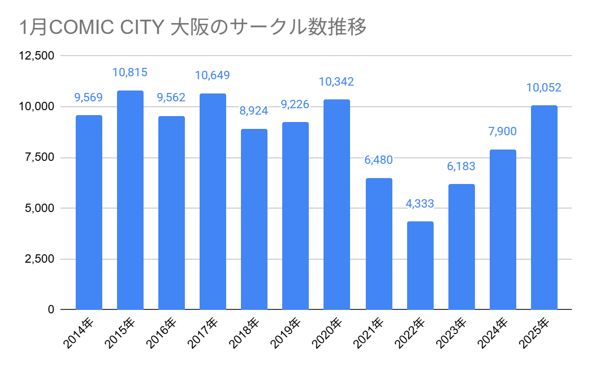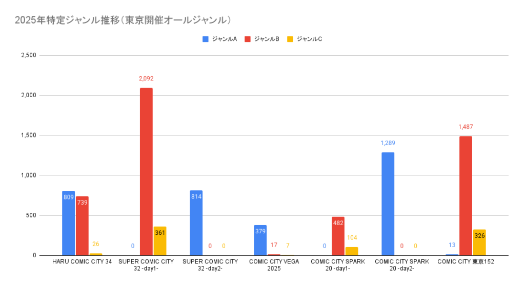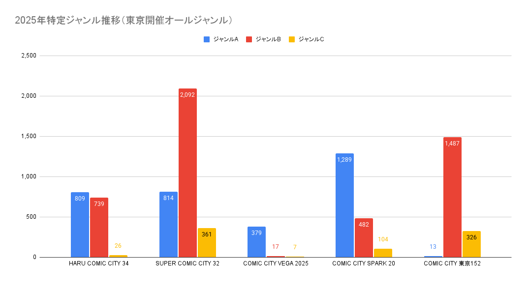 一例として、ここではまずあえてオールジャンルイベントにて、特定ジャンルに参加するサークルの数をグラフにしました(開催地は東京で統一しています)