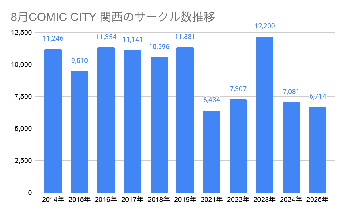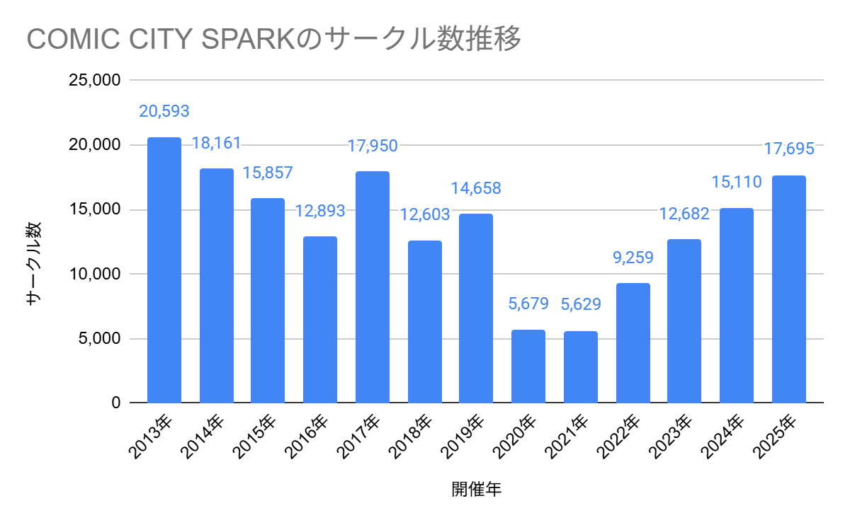 なお、本記事で扱うデータやグラフは、本サイトで集計したNAVIO(赤ブーブー通信社のウェブパンフレット)のサークルデータをもとに独自で算出しています。なお、特別な注釈がない限り、開催中止になったイベント分は数値に含んでいません。